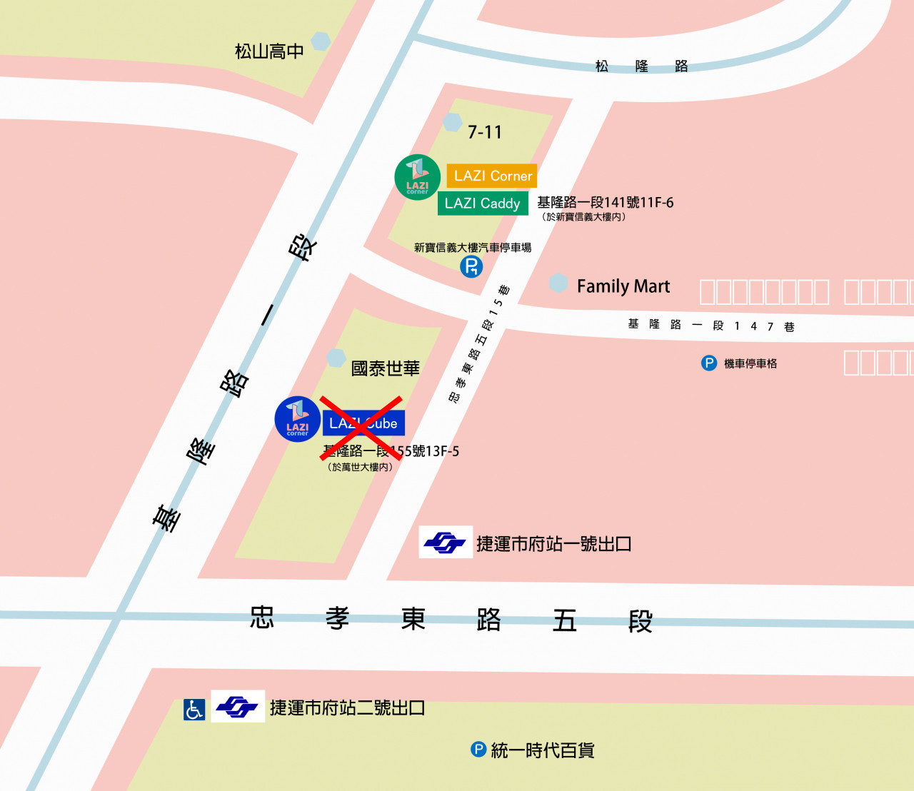 LAZI 本部(信義區) 本部有三間錄音室,分別是 LAZI Corner , LAZI Caddy 以及 LAZI Life. 從市府站1號出口步行約5分鐘距離,機車族可在周圍尋找路邊停車格,汽車部分可停在新寶大樓停車場。 停車場收費標準:$50/hr (僅收現金) google map