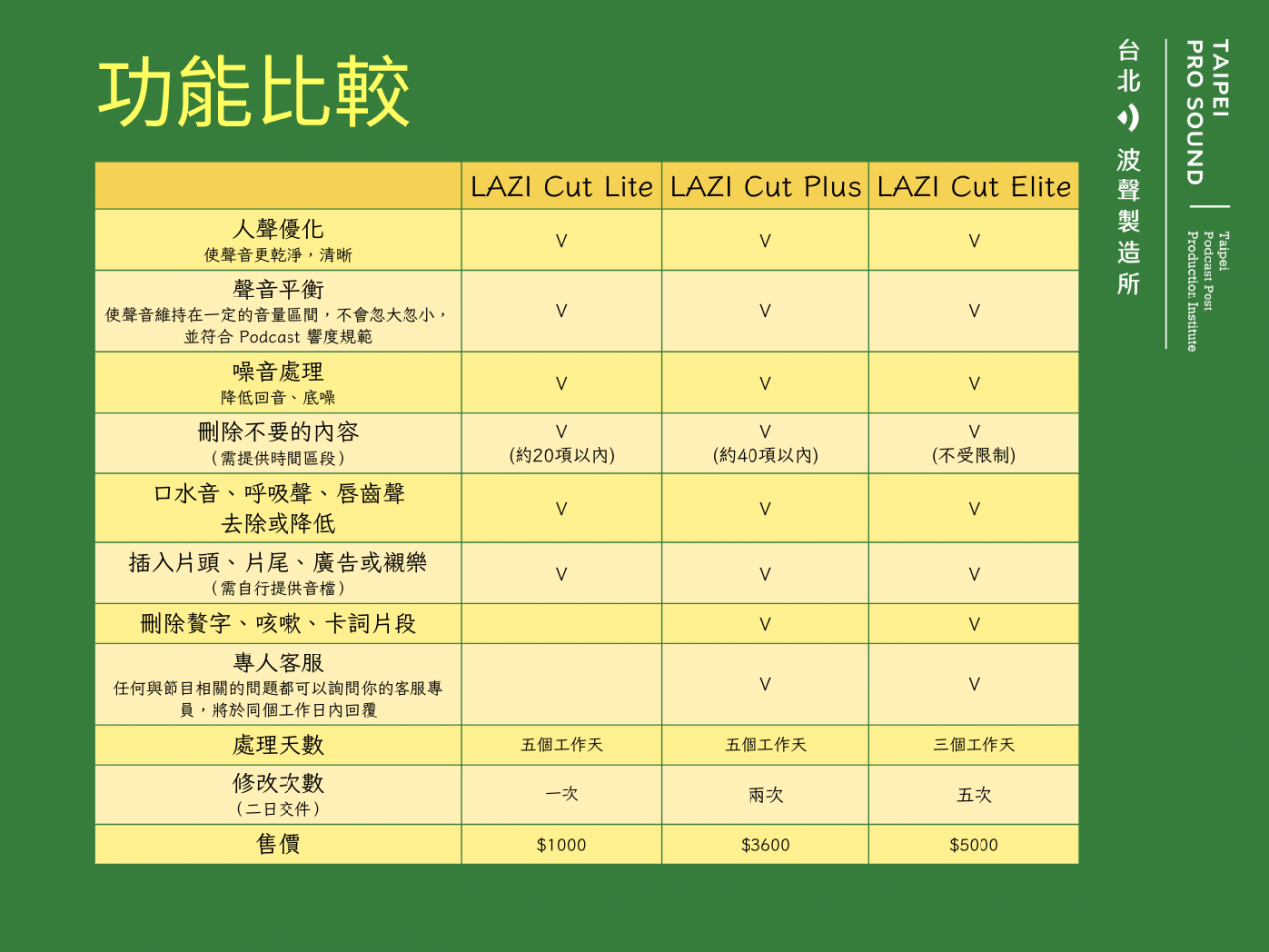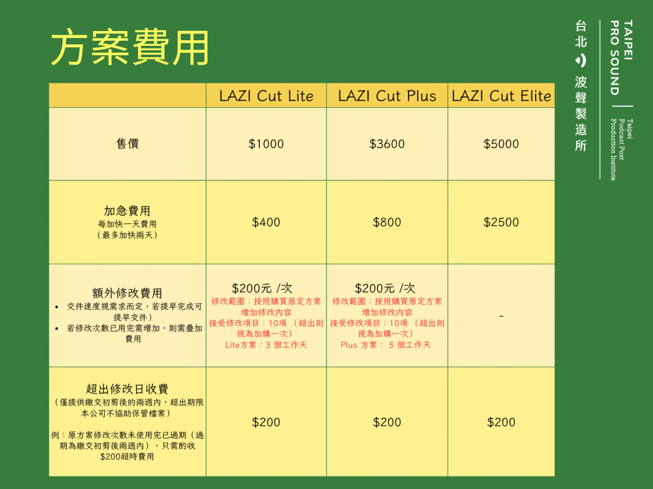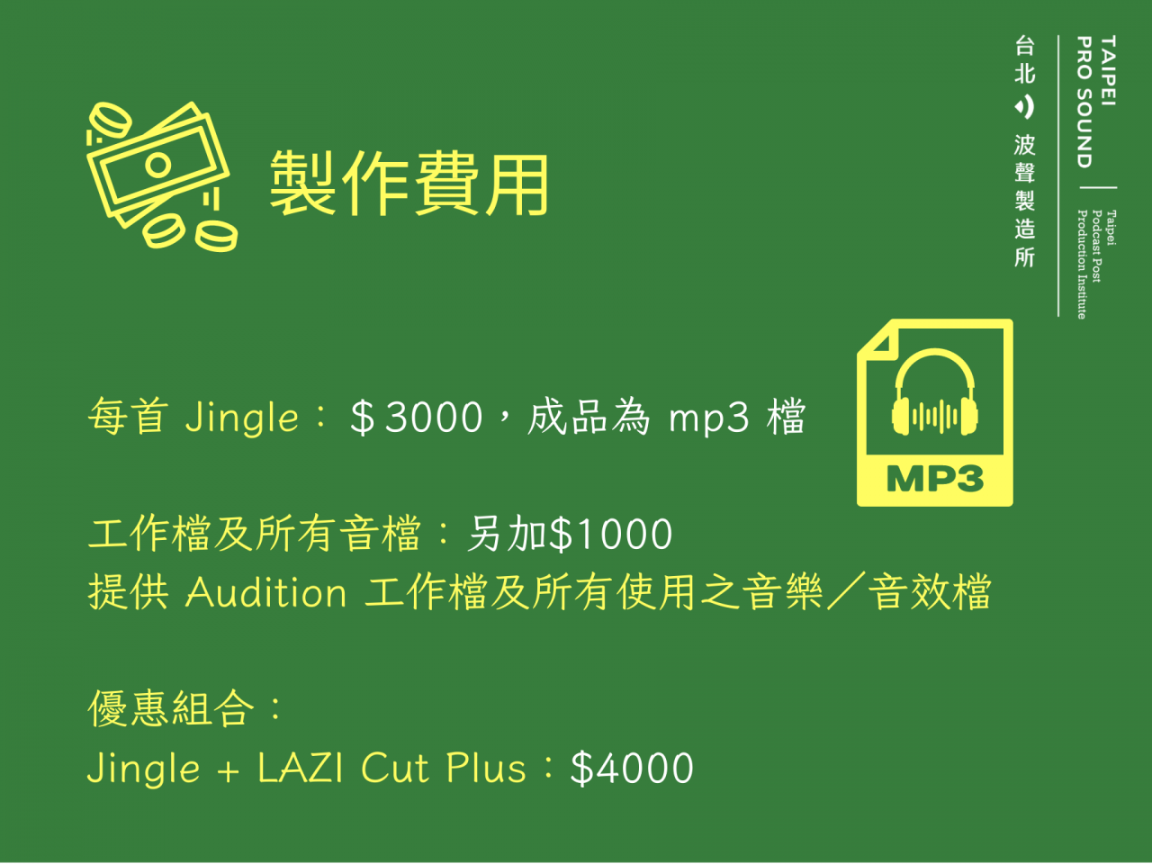 特價 LAZI Cut Lite(1小時) NT$2,000 NT$1,000 加入購物車 特價 LAZI Cut Plus(1小時) NT$4,000 NT$3,600 加入購物車 LAZI Cut Elite (1小時) NT$5,000 加入購物車 Jingle 製作 NT$3,000 加入購物車